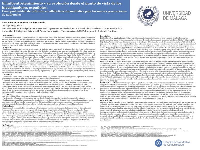 El infotainment es uno de los géneros que más éxito cosecha en la televisión actual. No obstante, la evolución de los formatos, así como la incorporación de recursos digitales, ha hecho del infoentretenimiento un concepto amplio y difícil de definir, tanto para los investigadores como para los artífices de programas. En España, a pesar de existir una tradición de consumo ligada al ocio y al entretenimiento, el infoentretenimiento aparece hace apenas un par de décadas con Caiga Quien Caiga (Telecinco, 1996), considerado el precursor del “pseudoperiodismo satírico” enfocado a la política, una tendencia que sigue hoy en auge. Este artículo reflexiona sobre el término del infotainment desde su primera mención por Krüger en 1988, hasta las investigaciones actuales, de las que destacan los estudios españoles por su interés contextual, ligado a circunstancias de crisis política y económica, lo que ha contribuido a incrementar la apuesta de las cadenas por estos programas y el interés de los ciudadanos por seguirlos. A partir de una revisión de más de cincuenta publicaciones, se reflejará la ambigüedad del término y el poco consenso entre la comunidad científica española, así como la escasez de estudios que lo abordan desde sus audiencias. Todo ello con la intención de compararlos con el texto de Krüger para demostrar que, hoy por hoy, sigue siendo un macrogénero experimental, que origina debates entre científicos, profesionales y espectadores, lo que lo convierte en una gran oportunidad para la reflexión en alfabetización mediática.