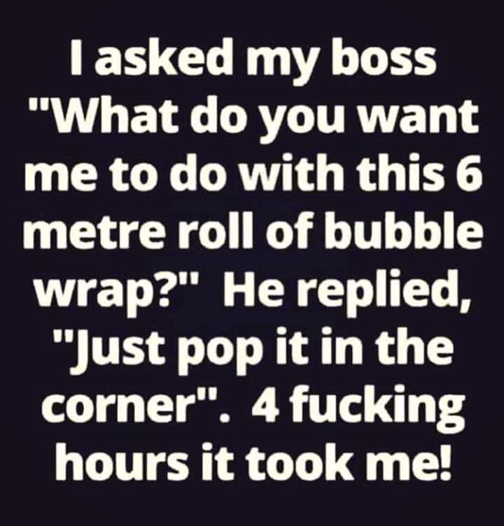 Tradução: Eu perguntei ao meu patrão "O que você quer que eu faça com esse rolo de 6 metros de plástico bolha?" Ele respondeu "Apenas pop it no canto." Isso me tomou 4 horas!