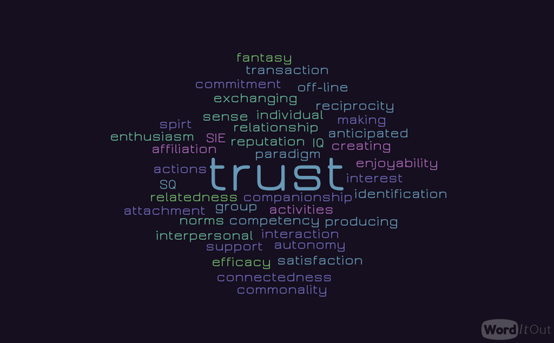 WIth word clouds, the more often a term comes up, the more space it takes up on the cloud. In this case, it is clear that “trust” comes up the most as a defining characteristic of building a sense of virtual community. Other patterns in defining characteristics include a sense of being related to one another (connectedness, identification, attachment, interaction, commonality, transaction, companionship, reciprocity) as well as a sense of ease and entertainment (enjoyability, satisfaction, efficacy, enthusiasm, spirit).