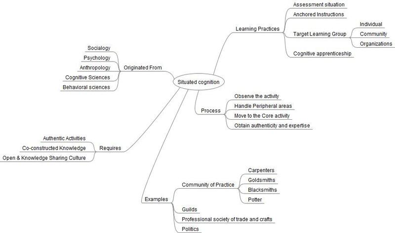 In Situated Cognition, the learning is grounded in situations and environment along with other actors (People, Experts, Community) interacting with the learner increasing his /her cognitive capabilities in that situation. It gives the name of “Situated Cognition” to such a method of learning. I am enclosing a mindmap to show the process, environment, requirements, and outcomes of Situated Cognition. In it, people learn from interacting with each other through shared activities and language knowledge sharing.