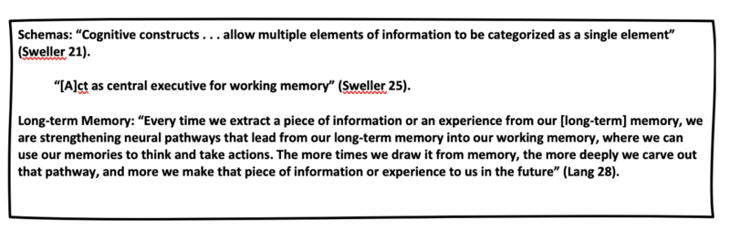 - “[E]xtracting the key ideas from new material and organiz[ing] them into a mental model and connect[ing] that model to prior knowledge” (Brown, Roediger, and McDaniel 6).