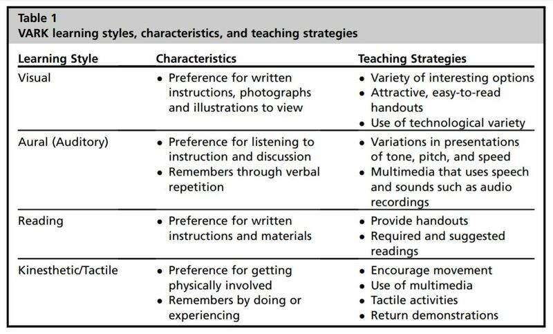 A variety of methods, modes, andmaterials should be available, but the best opportunities for learning are created from anawareness and use of individual learning styles. A summary of the VARK learning stylecharacteristics and suggested teaching strategies are presented in Table 1