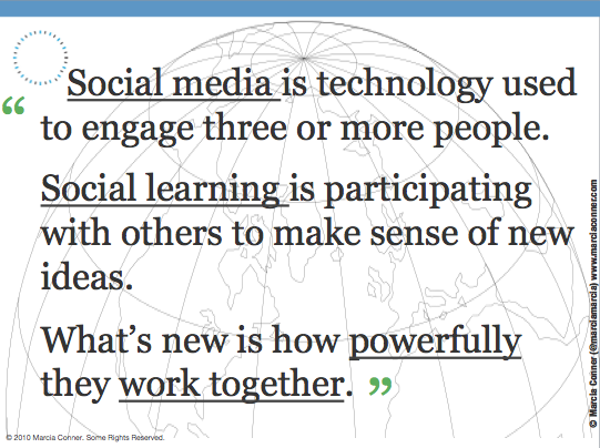 The concept I would like to focus on is Social Learning. According to Marcia Conner, author of the book The New Social Learning, the concept is defined as follows: