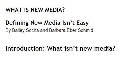 [1] Socha, Bailey and Eber-Schmid, Barbara. “Defining New Media Isn’t Easy.” New Media Institute. 2014. http://www.newmedia.org/what-is-new-media.html.