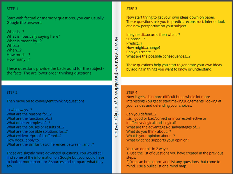 I found a nice illustration to this at Anthony Egbers and Kerryn White materials. They divide all questions into 4 groups and ask their students to focus on the third ant fourth groups.