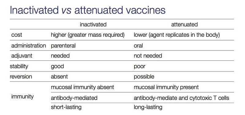 It is interesting to see the cost/benefit analysis of the attenuated vs inactivated. However, having inactivated vaccines, as Kate said, is very important for immunocompromised patients, such as those with HIV/AIDS. Perhaps they would benefit if more research was put it into inactivated vaccines and how to improve their immune response.