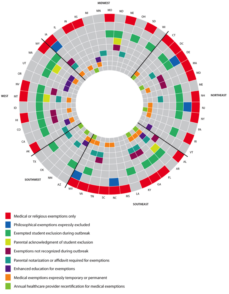 Since this graph was created in 2015, California has outlawed non-medical exemptions and Vermont has repealed their personal belief exemption.
