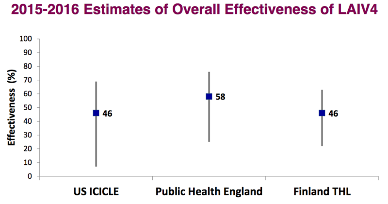 EDIT: I've realized that the CDC is recommending people don't get the spray because of low efficacy against Influenza A, and the graphs I've shown are overall effectiveness (likely combining efficacy against multiple subtypes).