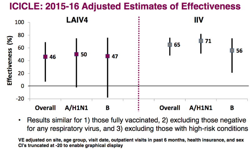 I'm not sure if ~50% is a good overall effectiveness for a vaccine, but it seems reasonable? Another slide from the same presentation compares LAIV4 to a different flu vaccine, called IIV (Inactivated Influenza Vaccine). This graph shows that LAIV4 does have lower overall effectiveness than the IIV vaccine.