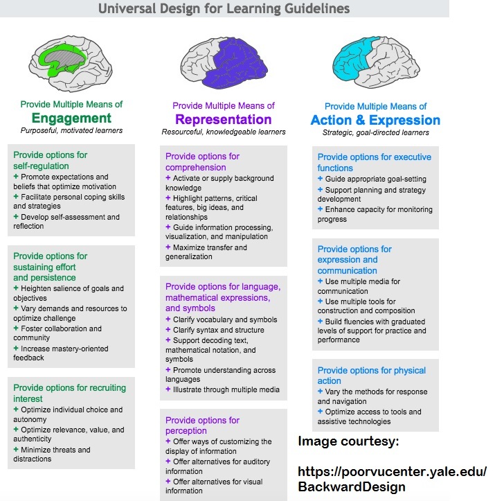 - Alternate navigation paths are possible easily with the aid of technology and concepts like the Universal Design for learning where the teacher can few multiple course tracks by grouping children.They get opportunities to be engaged in many ways.The teacher can represent course content in many ways of which some styles could strike with and be coherent with the child’s way of learning.There are multiple ways the child could express her literature in viz. audio, video, symbols, text, gestural etc.With multiple tracks of the course it gives scope for diagnosis and remedial lessons without the child noticing it or feeling guilt for.