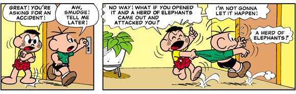 Still in this same sequence, we can unite the image, in this case, the Smudge and Jimmy Five’s facials expression, to the two characters’ speeches. As a typical multimodal genre, the oral text might contradict or complement information to the visual text giving greater visibility to the overall construction of the narrative sequence (Barbosa, 2014; Vergueiro et. al, 2014;Vergueiro; Ramos, 2015). In this process of understanding what is happening in the strips above, it depends on the reader’s background and linguistic types of knowledge to interpret these two information semioses - the visual and written one;