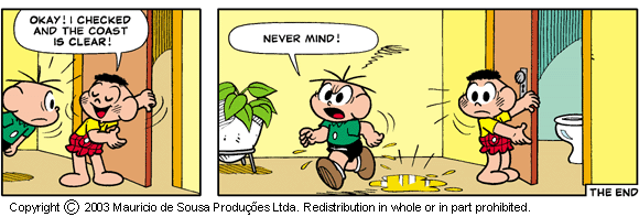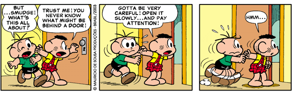 An alternative to another reading activity, oral skills can also be explored with oral readings. Considering that the lines in the comic strips are typical examples of informal oral texts, i.e. children's everyday speech, we can use them to explore the use of slangs[1] and / or other typical speech expressions in detriment of formal written language. Also in this aspect in working with the ability of speech, we can explore the characteristics of the characters’ speeches together with the grammatical structures used by them. Short phrases, imperative verbs, phrasal verbs such as the one found in the strips above - No, what? Just open this door and go in - can be taught so that learners can create their own stories as homework, for example.