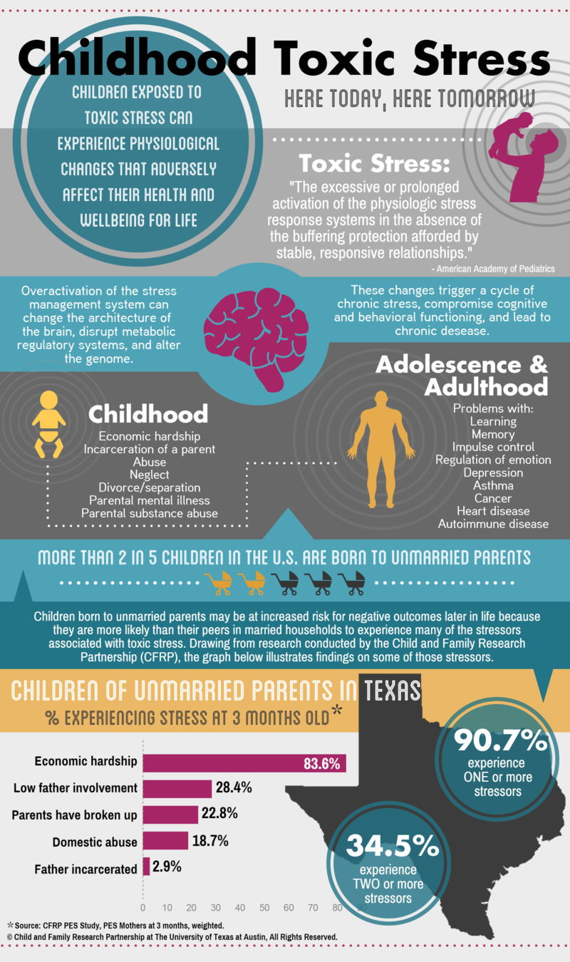 Acute and chronic stressors often experienced by children living in poverty influence and directly affect brain development. When we are stressed, our bodies naturally produce cortisol as a means to combat the stressors before us. This is commonly known as the fight or flight reaction. Chronic stress not only produces a constant flow of cortisol, but has been shown to decrease neural pathways and activity, permanently changing the brain and limiting learning and memory capabilities.