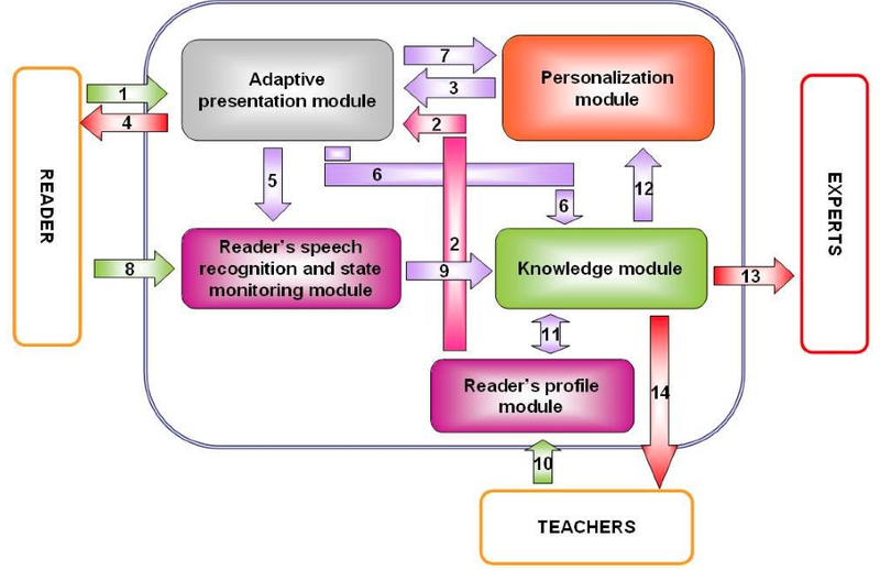 1. A learner profile is developed via the learner reading some text aloud and this being recorded by both a microphone and camera. This data is then analysed via speech recognition and face analysis services.