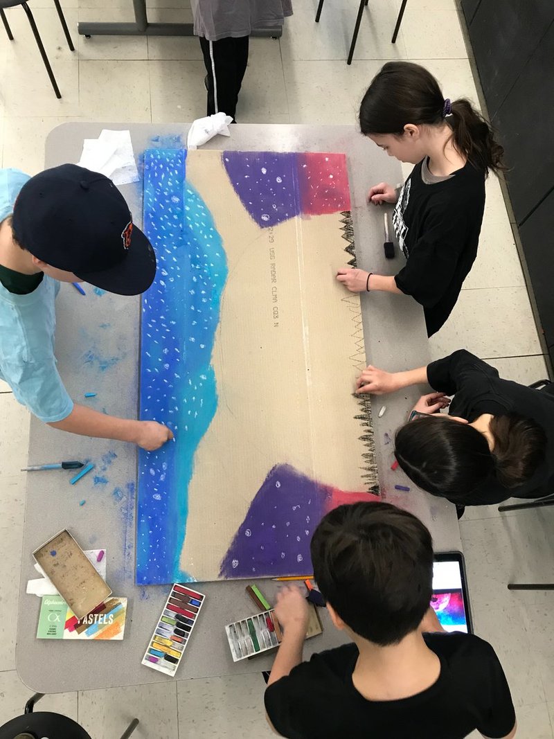 In my classroom, my fifth graders collaborate on a legacy ceiling tile project each year. Each table in my classroom, about 3-4 students, work together on a single ceiling table. Together, they have to pick an image (that they all agree on), create a design, delegate jobs, and work together to complete it. When I first started this project, my fifth graders had never previously done a collaborative art project. They were excited to create something permanent for the school, but had a lot of concerns about how they would work together on a 2 by 3 foot ceiling tile. In order to make them confident in their ability to be collaborative, I asked a couple of teachers to create a ceiling tile together while I recorded their collaborative work. My students were immediately sold...or they thought, “if teachers can do this, then we certainly can!”